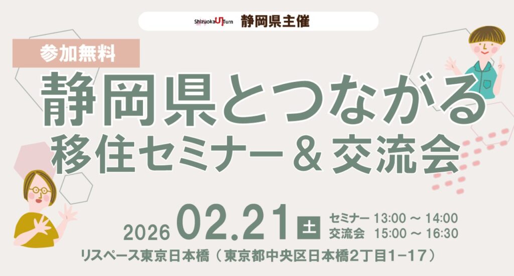 静岡県へのUIターン就職を検討している方を対象に、「静岡県とつながる移住セミナー&交流会」を開催します。本イベントは、UIターン就職を考え始めた方が最初に知っておきたい基礎情報を整理するセミナーと、実際に静岡へ移住し「つくる」を仕事にしている先輩移住者と直接交流できる交流会の2つのイベントを同日開催します。